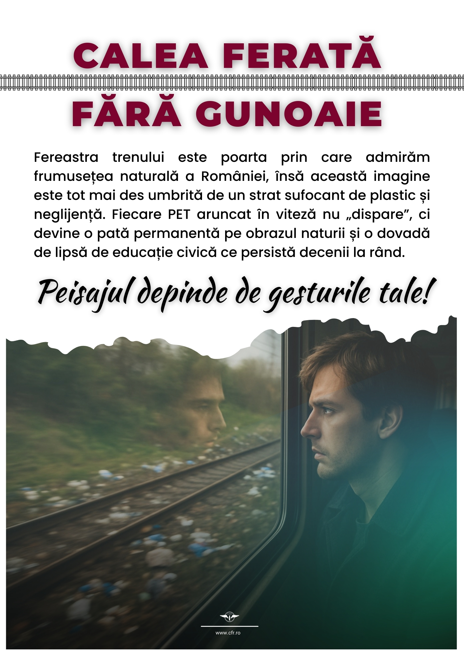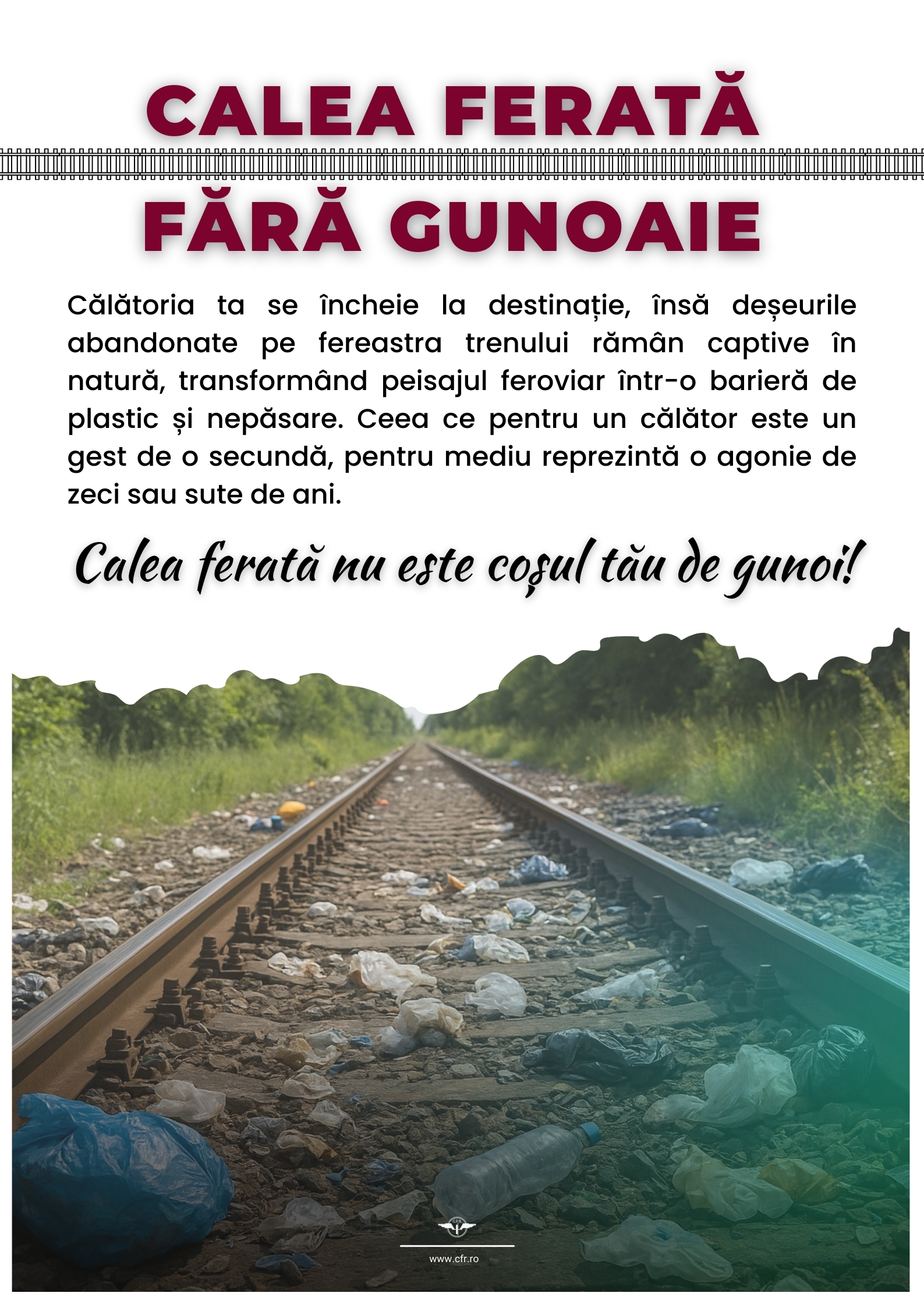 Compania Națională de Căi Ferate „CFR” S.A. lansează campania națională de informare și conștientizare civică „CALEA FERATĂ FĂRĂ GUNOAIE”, un demers instituțional dedicat prevenirii depozitării neautorizate a deșeurilor în zona infrastructurii feroviare și consolidării responsabilității civice față de mediul înconjurător.